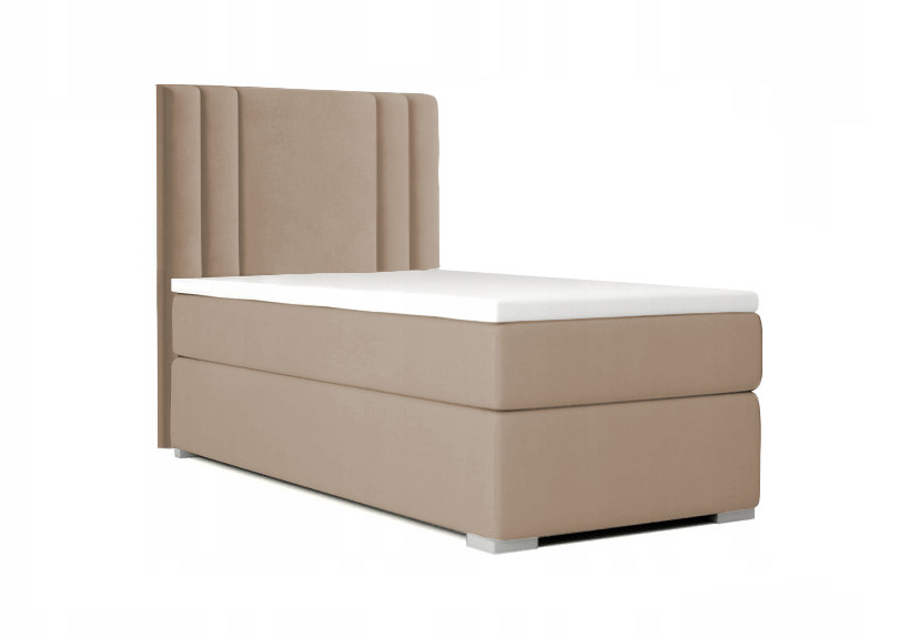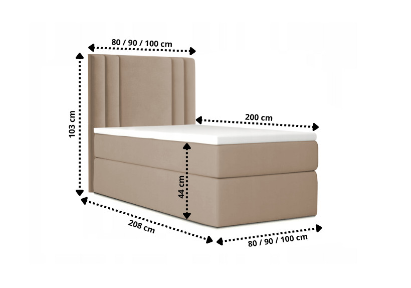 Boxspringbett - BEST MINI. Das Bett besteht aus einer Matratze aus Bonellfedern + hochelastischem Schaumstoff T30, einem Bettzeugbehälter, der sich von der Vorderseite des Bettes aus öffnen lässt, und einer federbelasteten automatischen Einheit zum einfachen Öffnen des Behälters.